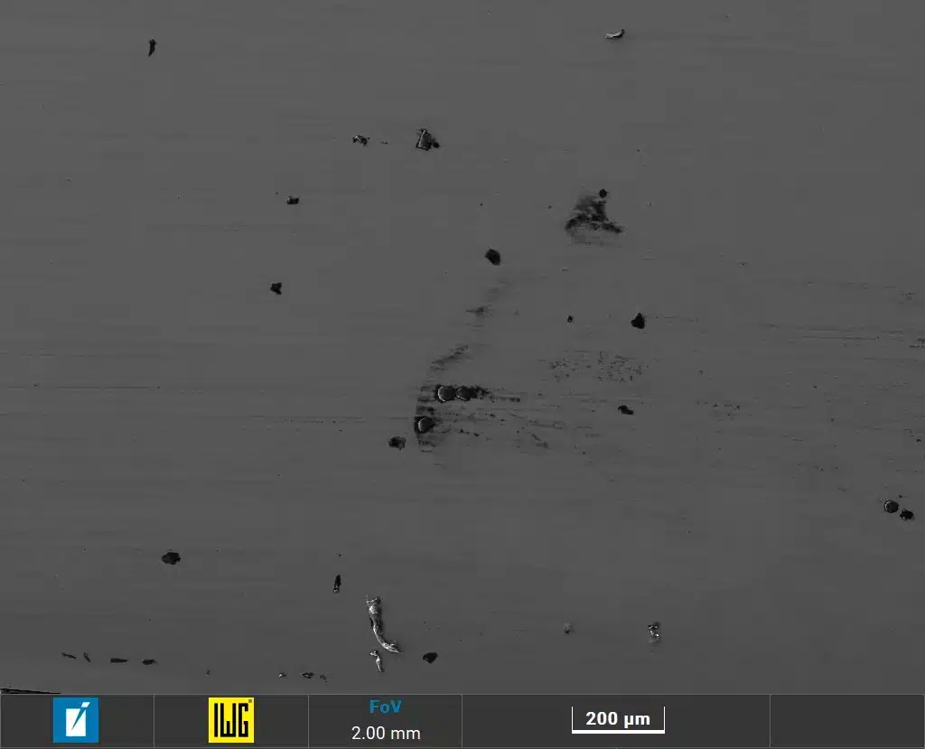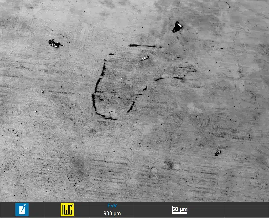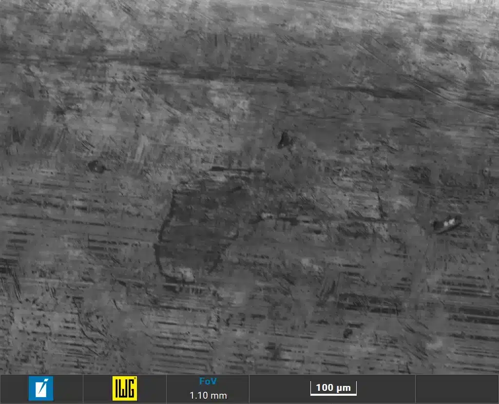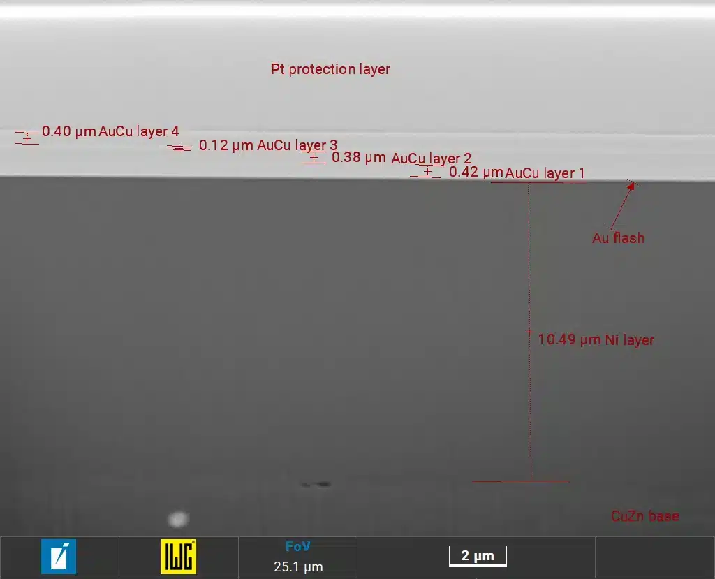Recently, we received a very beautiful cap of a writing instrument in rose gold, but unfortunately the surface was completely tarnished. The optical inspection was quickly done. The defects are often visible to the naked eye, but not the cause. In this specific case, our colleagues from the technical department chose the FIB-SEM electron microscope as the best possible analysis instrument because it delivers very precise results in the search for defects. The FIB-SEM allows the micrograph to be taken exactly at the defect location, which can then be analyzed with EDX and mass spectrometer.