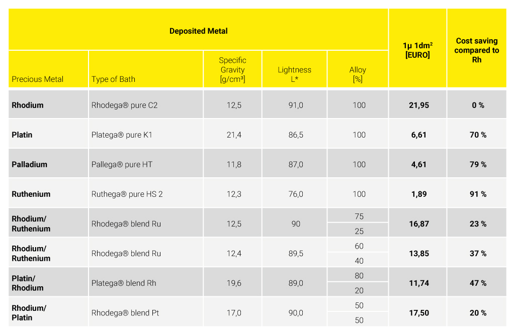 Wir haben Lösungen für dekorative und technische Anwendungen entwickelt, die Ihnen kaum Kompromisse hinsichtlich Qualität und Optik abverlangen. Ganz im Gegenteil, in unseren Innovationsprozessen ist es uns gelungen Eigenschaften wie Abriebbeständigkeit bei unserem neu entwickelten Platega® blend Rh sogar zu verbessern: brillant weiße Überzüge, die den Vergleich zu purem Rhodium nicht scheuen müssen und einer vergleichbaren Whiteness. Und das bei deutlicher Reduzierung der Edelmetallkosten.